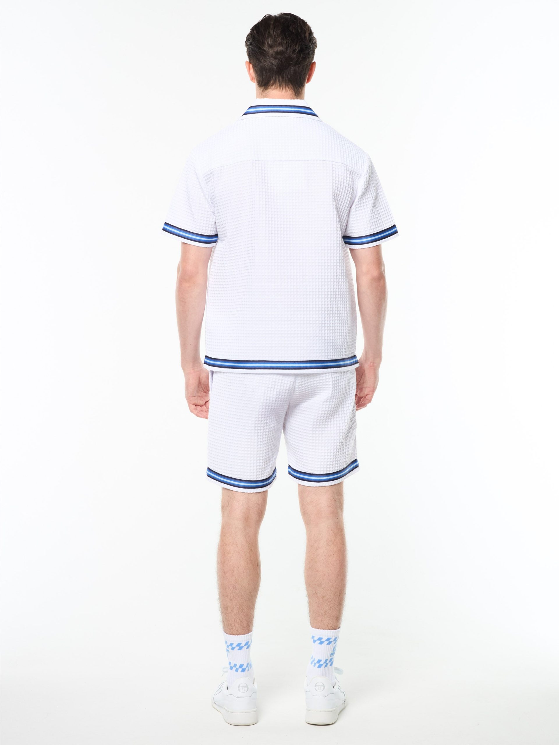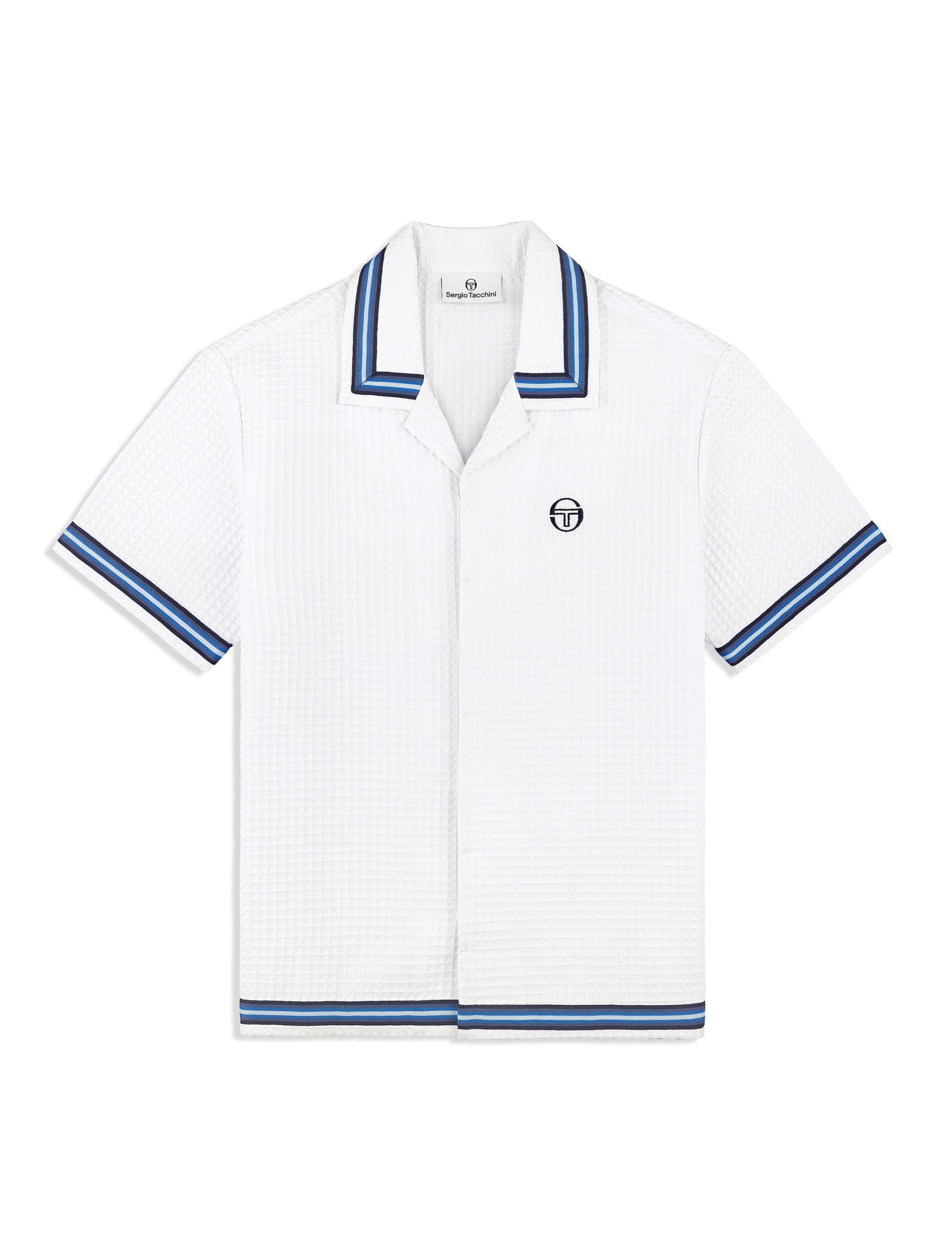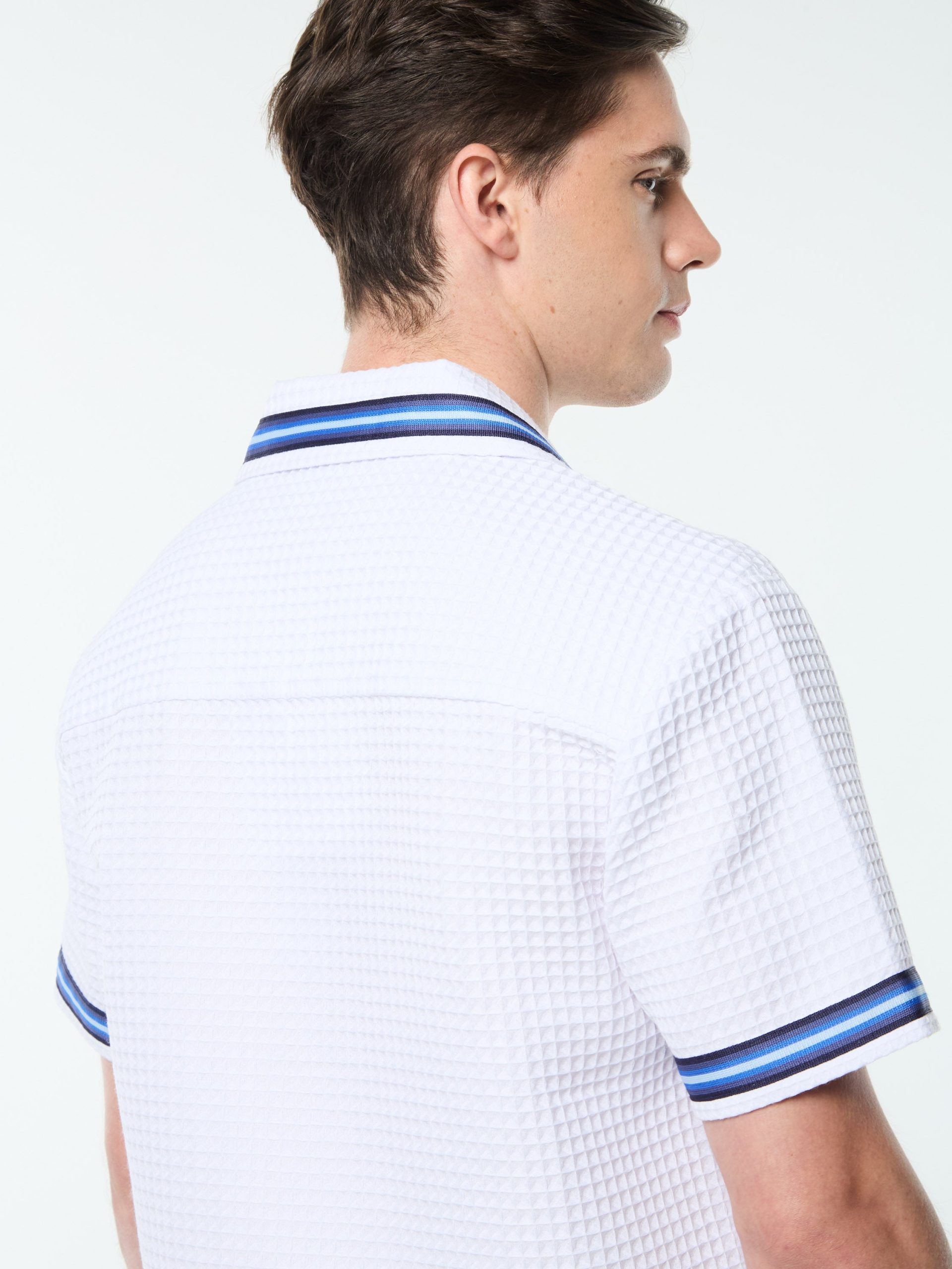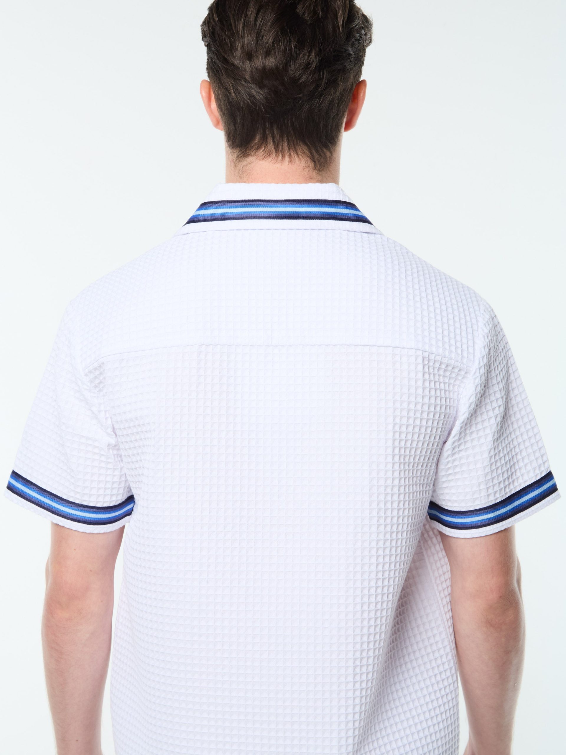 Effortless polish with a textured twist. The Chiaro Cabana Shirt brings breezy structure to transitional layering, crafted from soft waffle-knit for all-day comfort. Stripe taping at the trims and a concealed button placket add a tailored finish—whether you’re poolside, on vacation, or leveling up your weekend rotation.