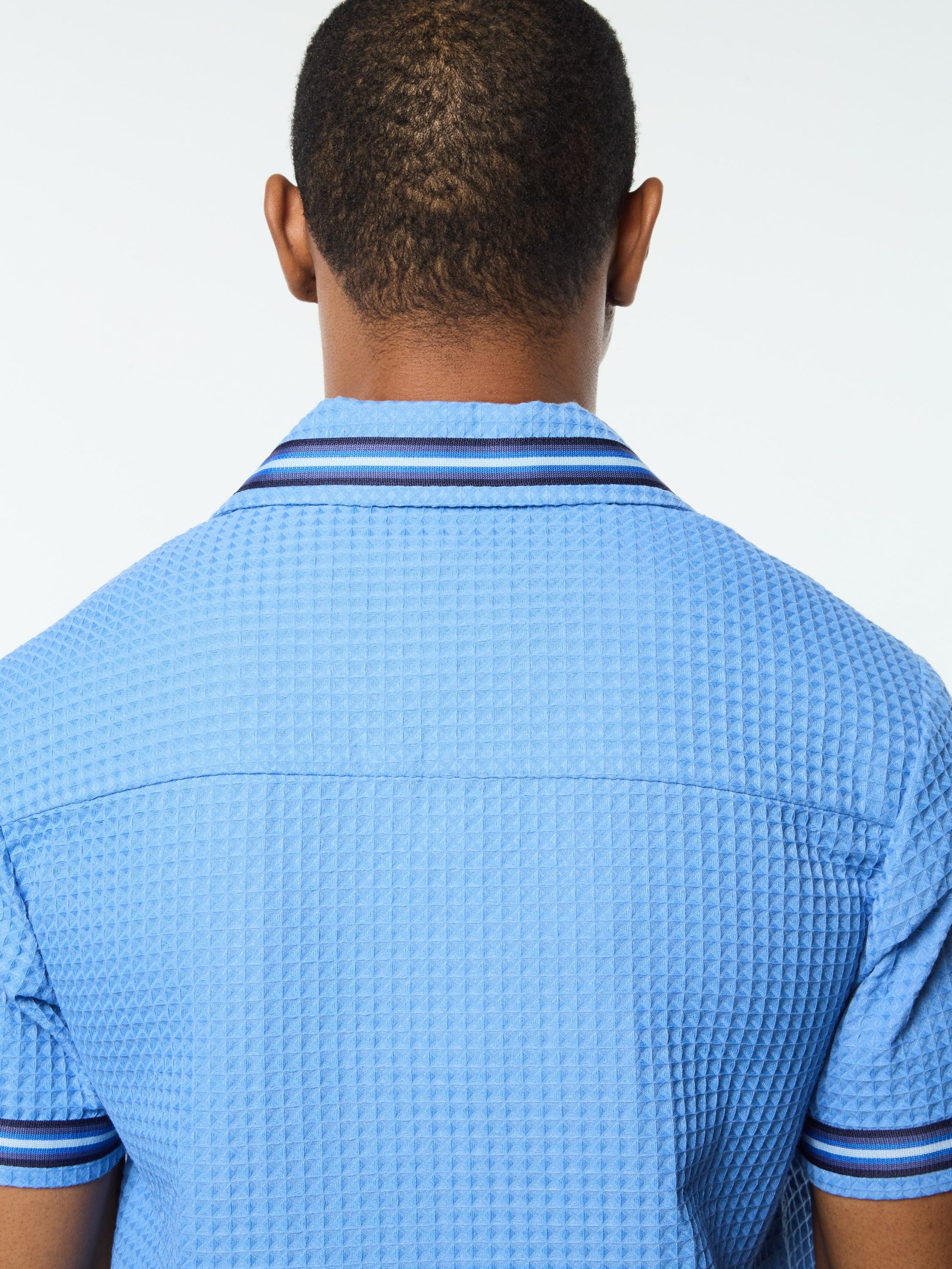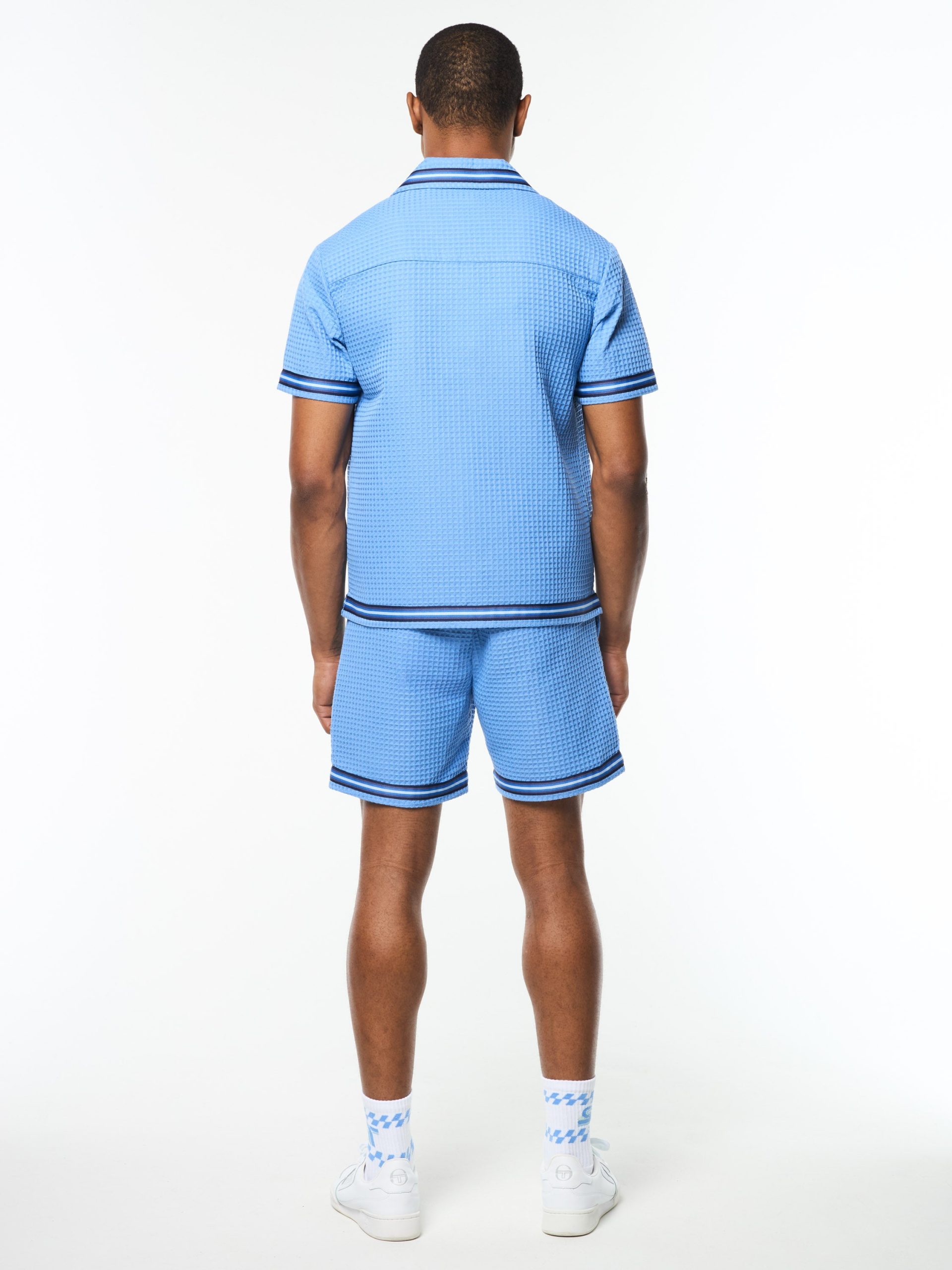 Effortless polish with a textured twist. The Chiaro Cabana Shirt brings breezy structure to transitional layering, crafted from soft waffle-knit for all-day comfort. Stripe taping at the trims and a concealed button placket add a tailored finish—whether you’re poolside, on vacation, or leveling up your weekend rotation.
