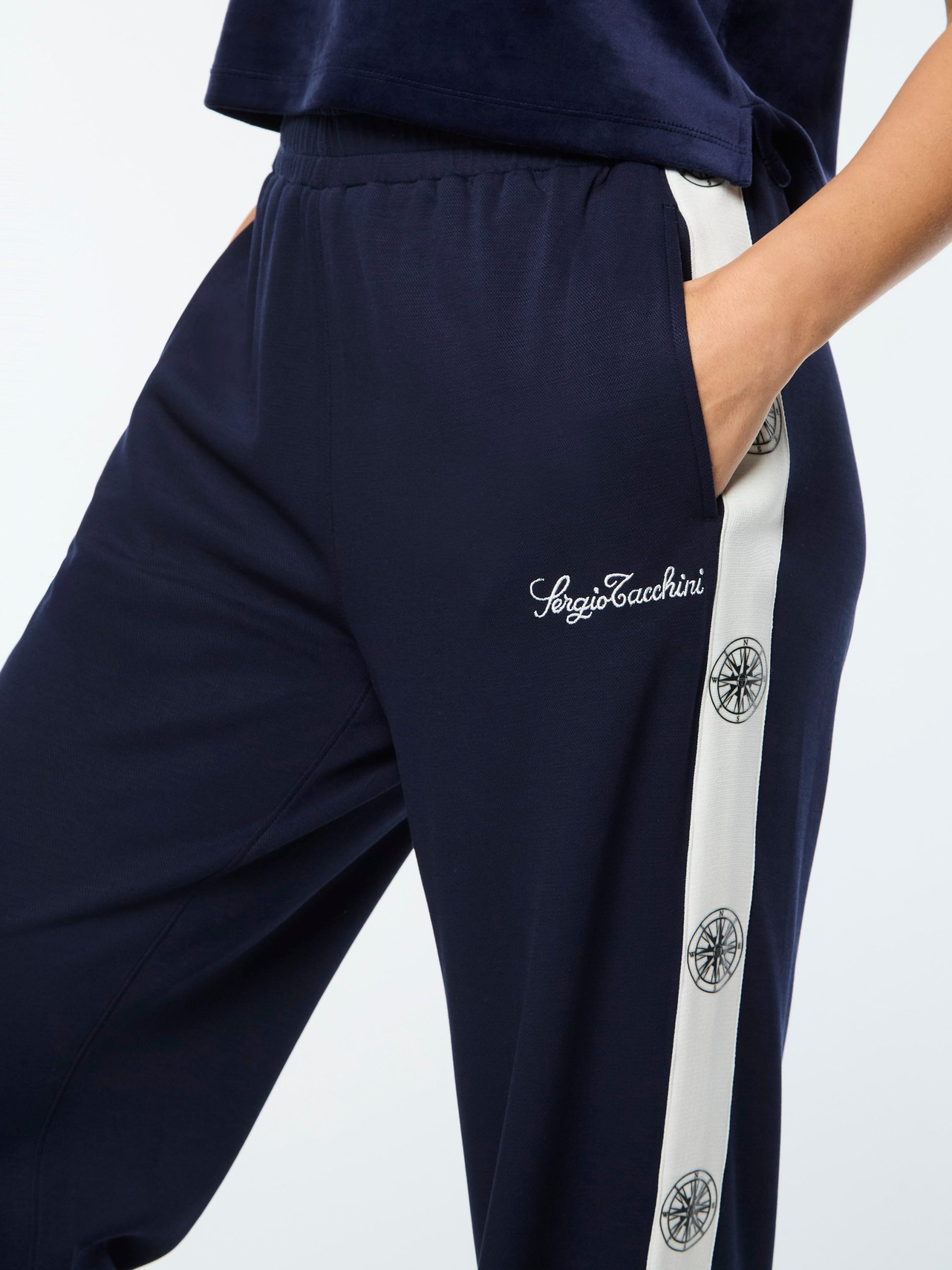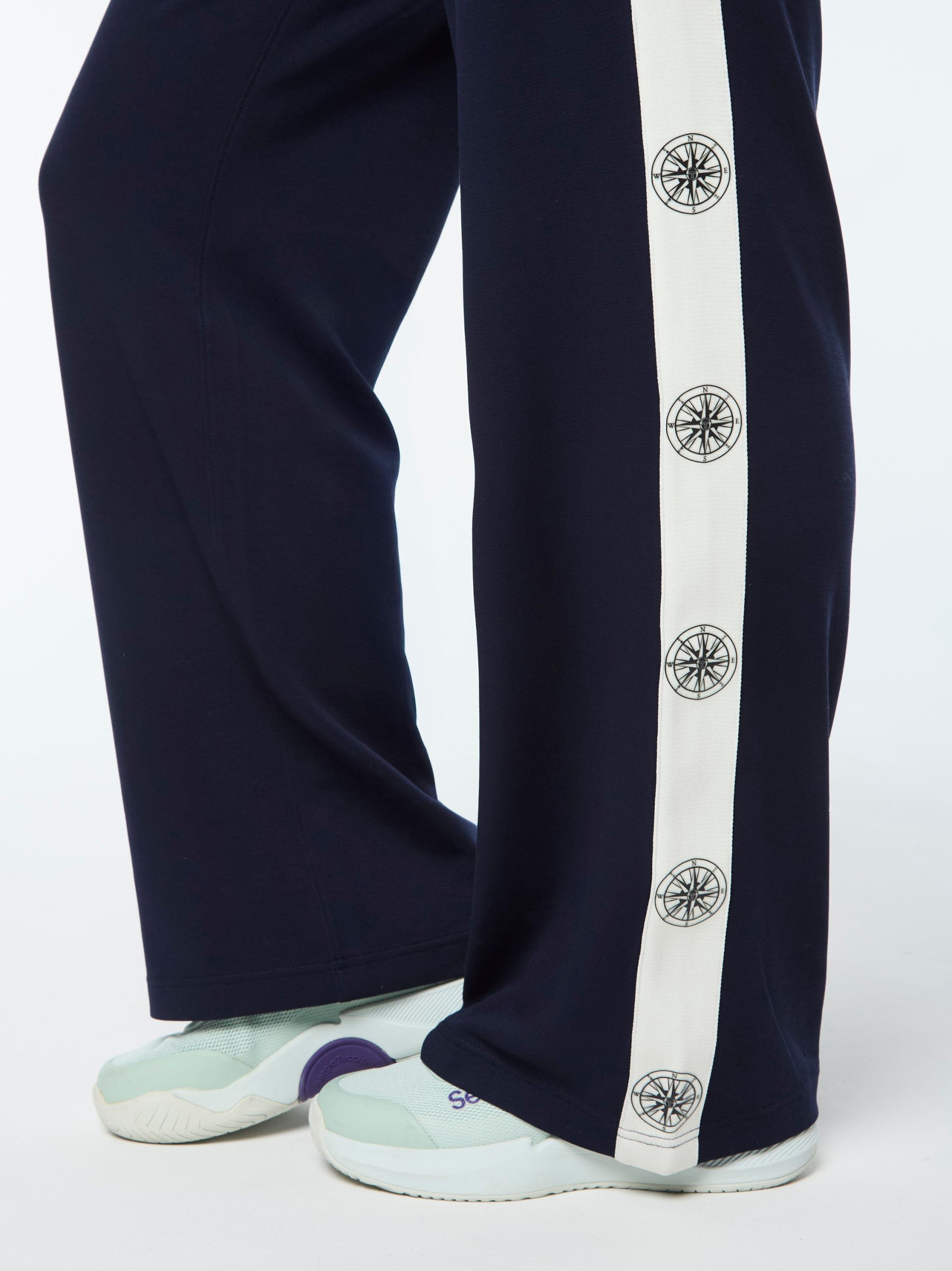 Set sail in our Women’s Bussola Track Pant, crafted from a luxurious Tencel blend piqué fabric that’s soft and breathable with a subtle stretch—perfect for active individuals and athleisure-wear enthusiasts alike. Featuring a nautical “Compass” rose repeat motif across contrast taping down the legs, these refined track pants offer style and comfort with a Riviera vibe.Pair with the Women’s Bussola Track Jacket for the full fit. (Sold separately)